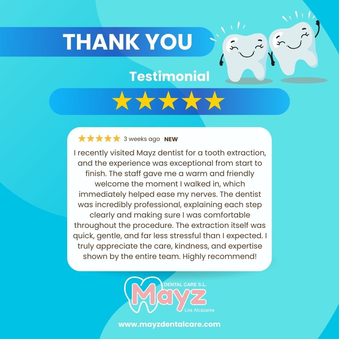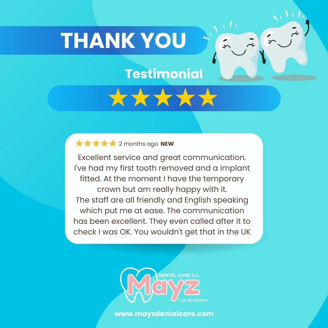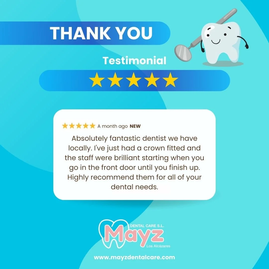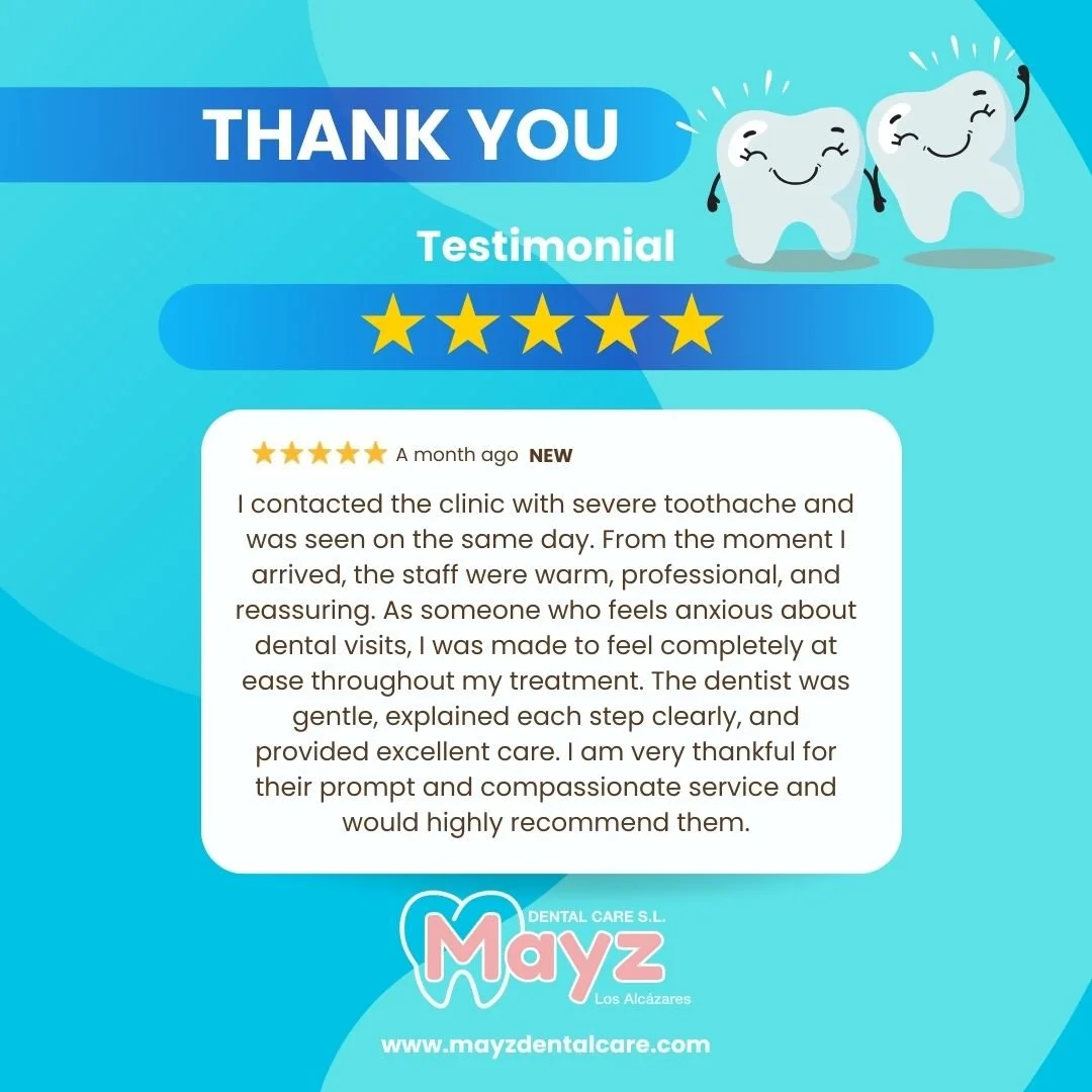 At Mayz Dental Care, we are proud to be a modern, English-owned dental practice located in the heart of Los Alcázares, Murcia. Our highly skilled team specialises in dental implants and advanced restorative treatments, helping patients regain their confidence with healthy, natural-looking smiles.